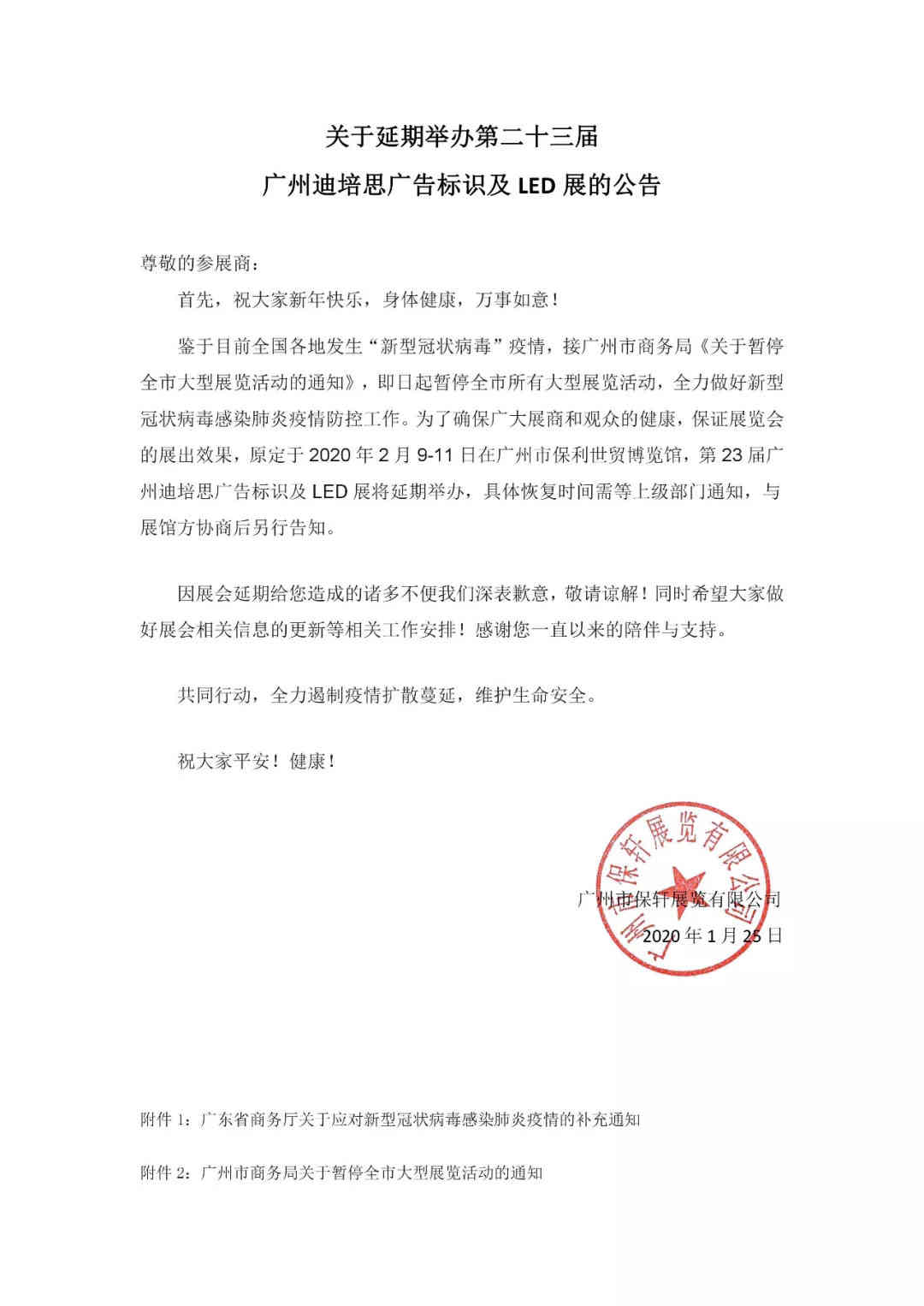 針對(duì)目前“新型冠狀病毒”的疫情防控要求,接廣州市商務(wù)局《關(guān)于暫停全市大型展覽活動(dòng)的通知》,即日起暫停全市所有大型展覽活動(dòng),全力做好新型冠狀病毒感染肺炎疫情防控工作。為保障廣大展商和觀(guān)眾的健康,保證展覽會(huì)的展出效果,原定于2020年2月9-11日在廣州市保利世貿(mào)博覽館舉辦的“第23屆迪培思廣州國(guó)際廣告標(biāo)識(shí)及LED展”將延期舉辦,具體恢復(fù)時(shí)間將根據(jù)形">